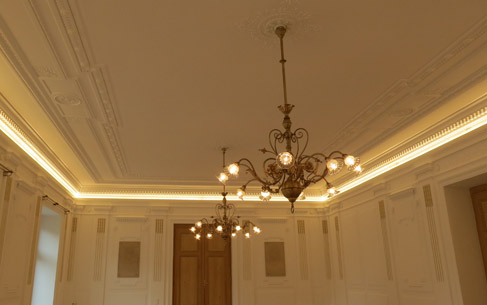 Im Zuge von Sanierungsmaßnahmen des Sitzungssaales wurde an uns die Anforderung einer zeitgemäßen Beleuchtung unter Berücksichtigung des Denkmalschutzes gestellt.