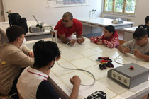 Wir wollten den jungen Burschen und Mädchen jedoch nicht nur theoretisches Wissen vermitteln, sondern sie selbst testen lassen, ob ihnen diese Art von Arbeit überhaupt gefällt. Wie sagt man so schön - learning by doing. Die Schülerinnen und Schüler wurden in vier Gruppen aufgeteilt und jede Gruppe bekam einen Lehrling zur Seite gestellt. Die Lehrlinge erklärten ihren Gruppen, wie man selber aus einem flexiblen Kabel, einer Kupplung und einem Stecker, ein 1-Meter langes, funktionsfähiges Verlängerungskabel herstellen kann.